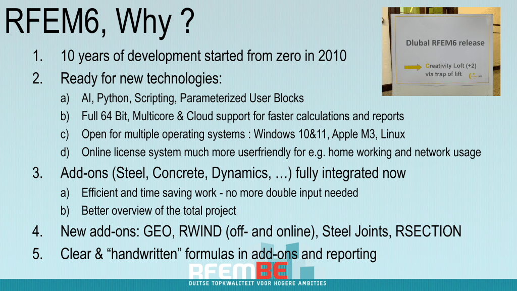 Before noon Jo Gijbels presented a broad overview of what Dlubal RFEM6 offers today for engineers checking steel, concrete and timber structures. Attached below one of the slides that was explained in detail. If you want to learn more, contact us for more info.