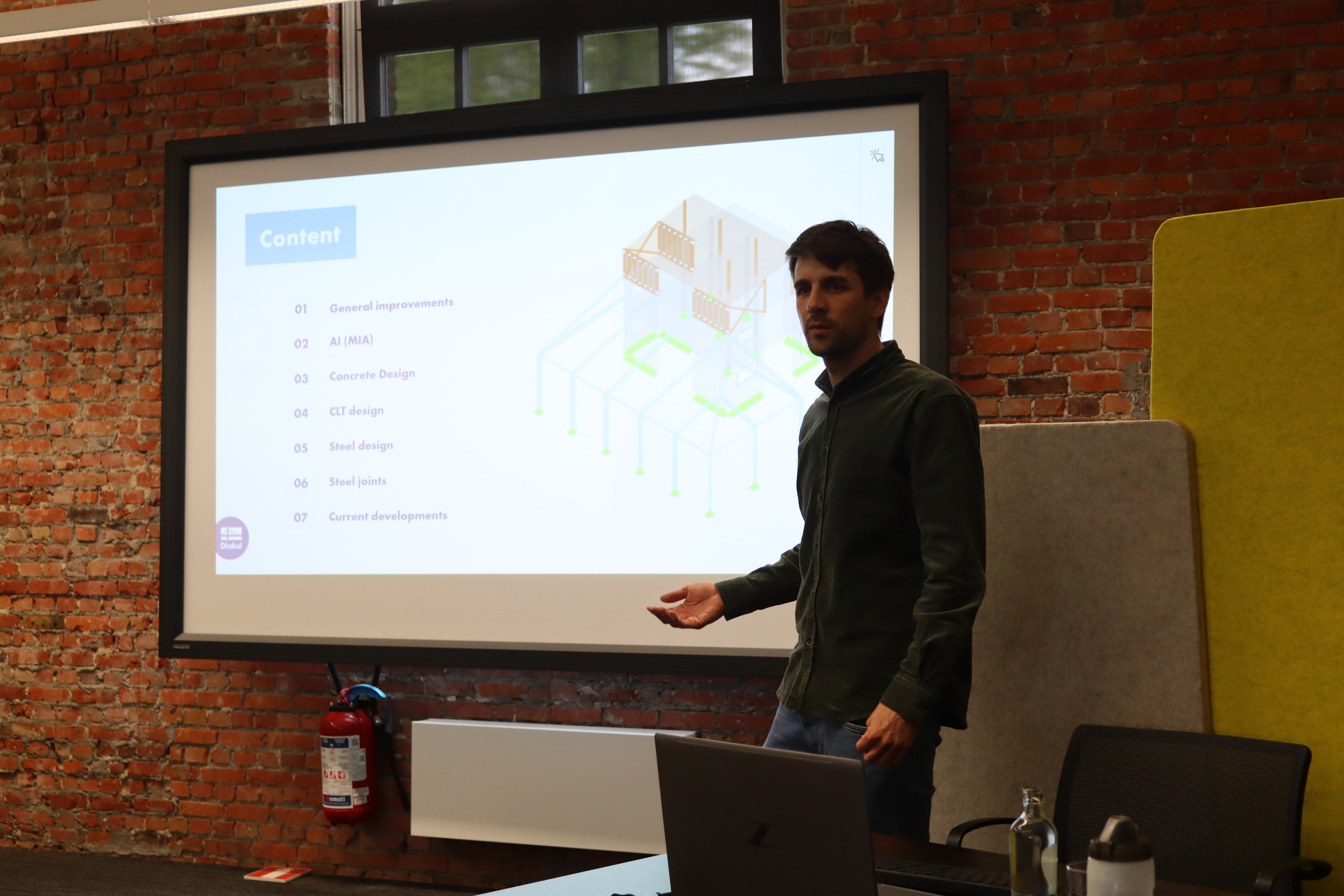 In the afternoon Dr. Ing. Jonas Bien explained the crowd how to model and check a hybrid steel, concrete and timber model (see picture below).