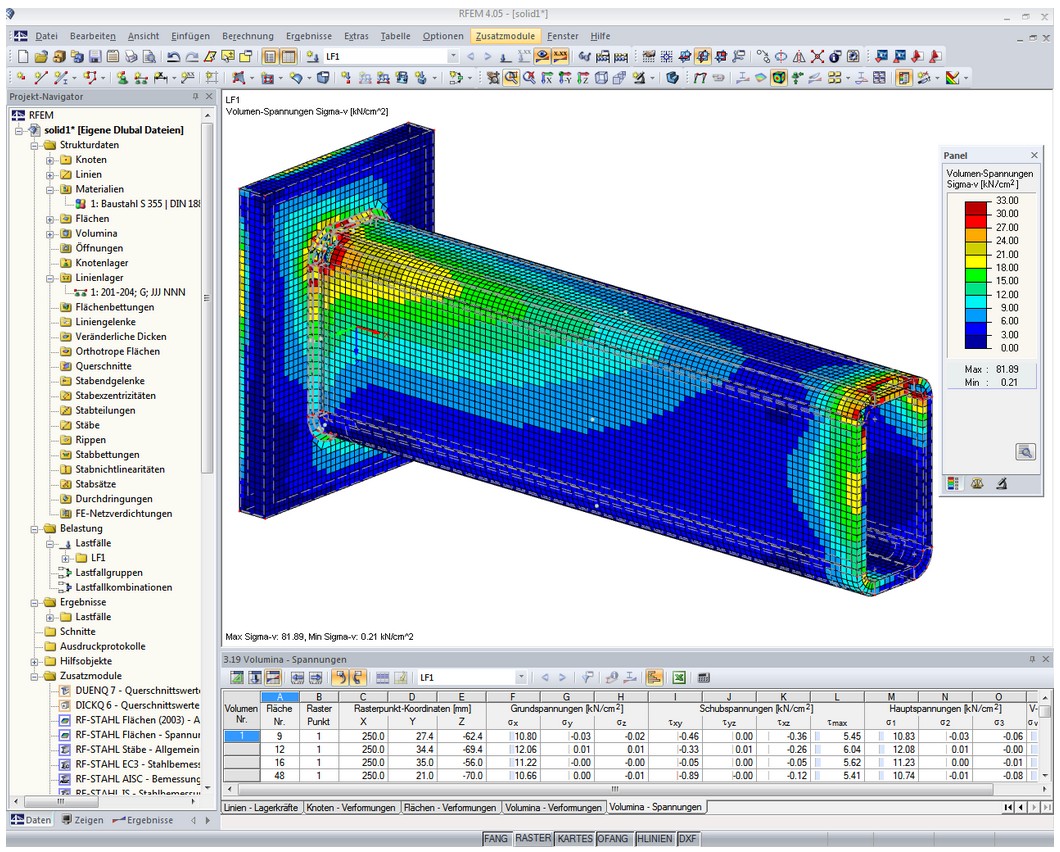 In RFEM kan de gebruiker d.m.v. de eindige elementen methode (EEM) constructies uitrekenen. RFEM ondersteunt 1D elementen (staven), 2D elementen (platen, wanden en schijven) en 3D volume elementen (solids). In onderstaande figuur een voorbeeld van een toepassing met 3D volume elementen in RFEM.